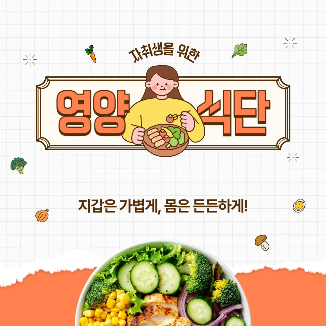 - 영양 균형의 중요성: 건강한 자취 생활을 위해 탄수화물, 단백질, 지방은 물론 비타민, 미네랄까지 골고루 섭취하는 것이 중요해요.