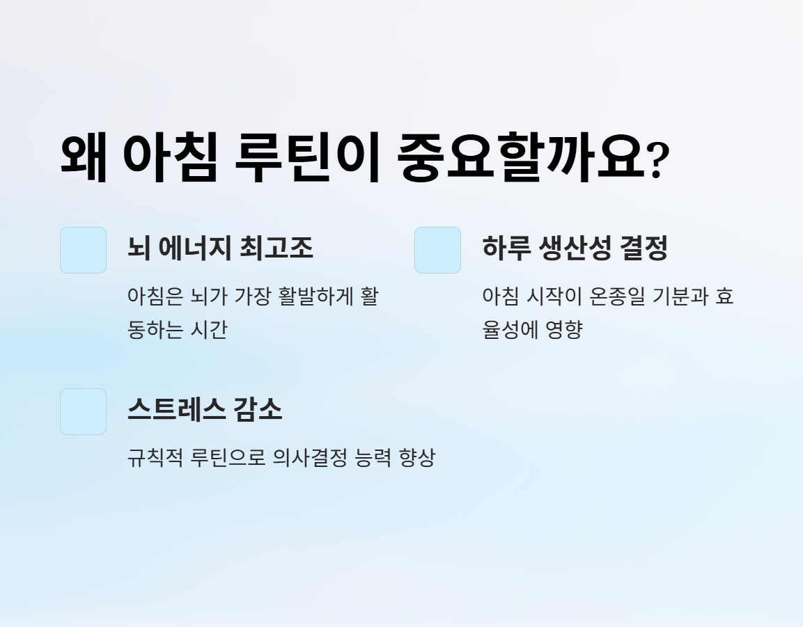 아침 루틴은 '완벽'보다는 '지속 가능성'이 중요해요. 처음부터 너무 많은 걸 넣으려고 하지 마시고, 1~2가지부터 시작해서 점차 늘려가는 것을 추천합니다!