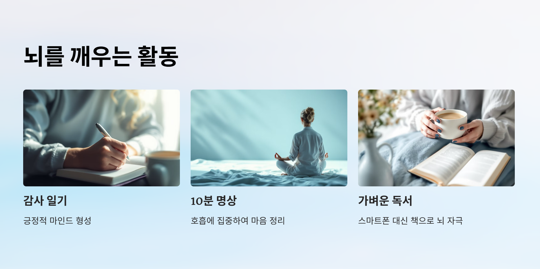 - 스마트폰은 잠시 잊고 뇌 깨우기: 명상, 독서, 감사 일기로 아침을 차분하게 시작하세요.