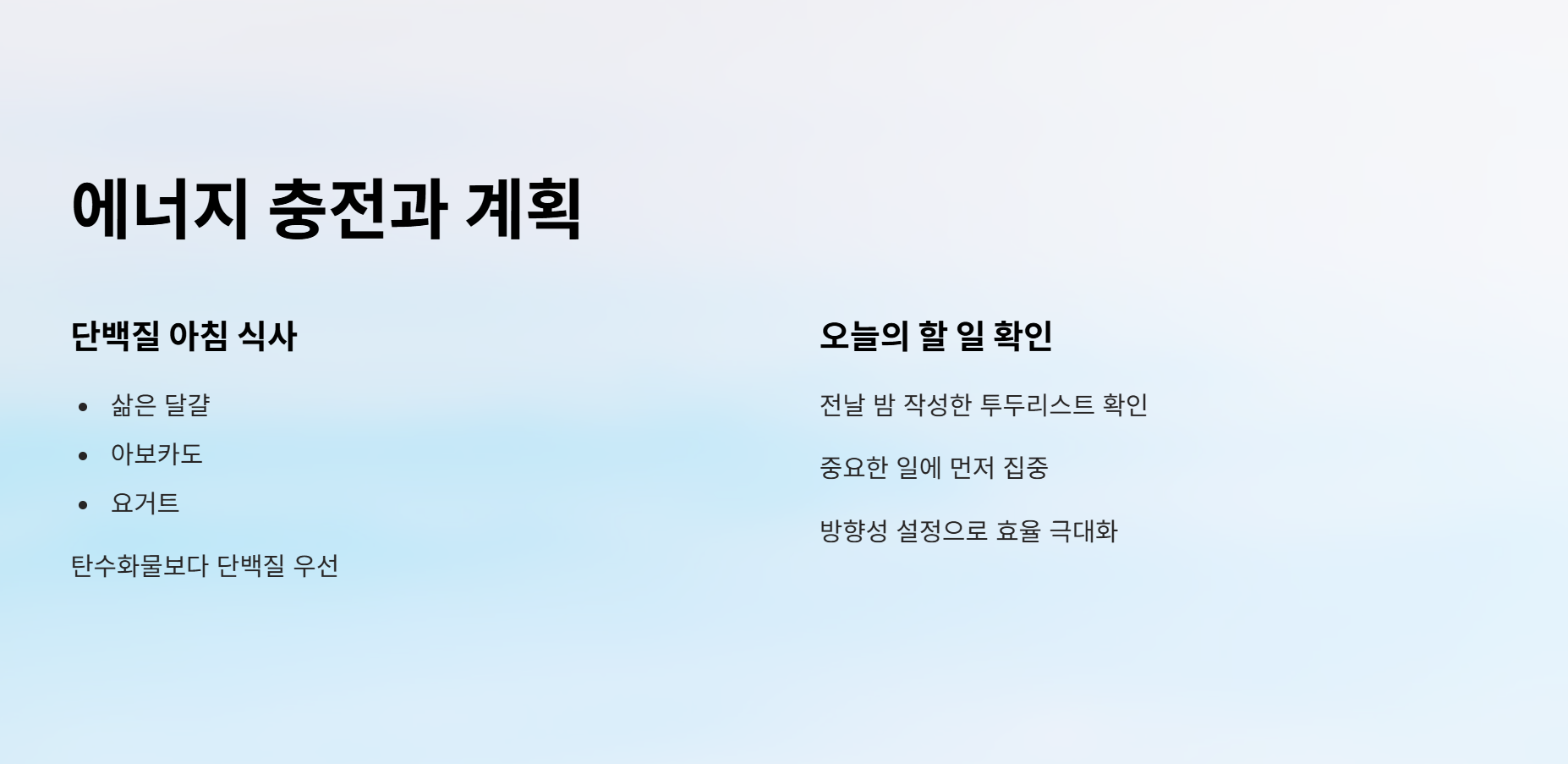 - 오늘 할 일 미리 확인하며 집중 준비: 하루의 목표를 상기하며 계획적으로 움직이세요.