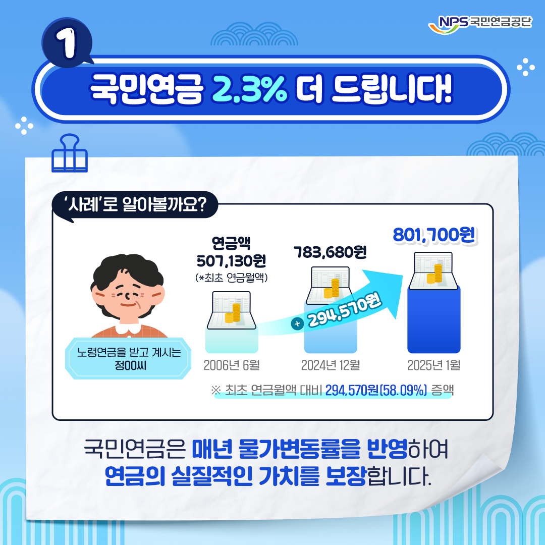 국민연금은 물가 상승률과 소득 상승률을 반영하여 매년 연금액이 조정됩니다. 특히 수령 개시 후에는 매년 1월 1일부터 전년도 전국소비자물가변동률에 따라 연금액이 인상되니, 실질 가치가 보장되는 안전한 자산이라고 볼 수 있어요.