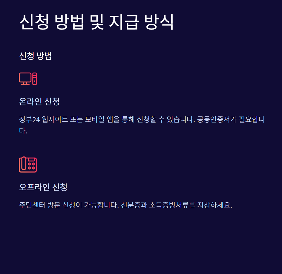 - 오프라인 신청: 주소지 읍면동 주민센터에 방문 후 신청
