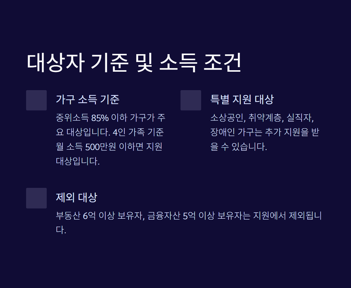 위 인용처럼, 이번 지원의 핵심은 실질적인 경제적 도움이 필요한 가구</strong에 집중되어 있어요. 구체적인 기준은 ‘2025년 기준 중위소득 100% 이하’입니다. 이는 4인 가구 기준 약 570만 원 이하의 월소득을 의미하며, 실제 기준은 가구원 수에 따라 달라져요.
